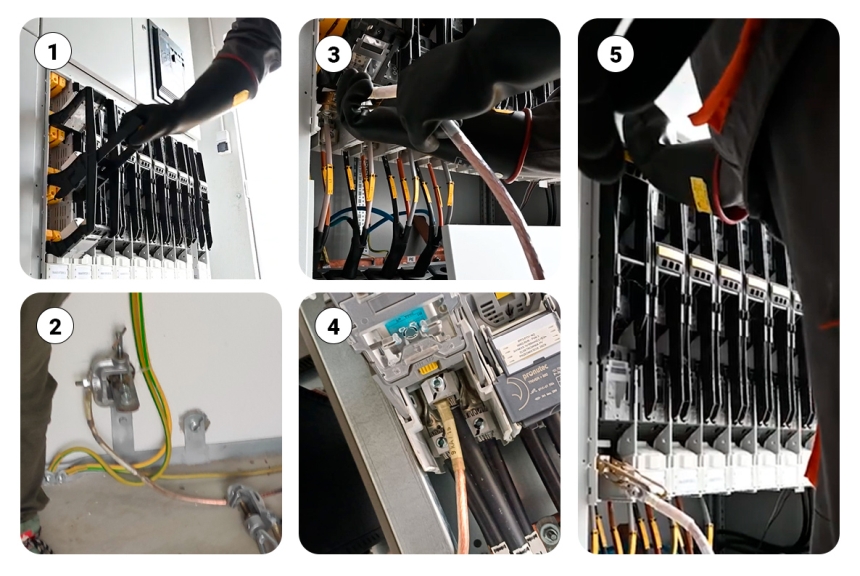 1. Circuit disconnection using a fuse switch. 2. Connecting the earthing device to the station’s PE conductor. 3. L3 line earthing. 4. It is possible, although not recommended, to connect the earthing to the V-terminal of phase L3. 5. Reconnecting the circuit