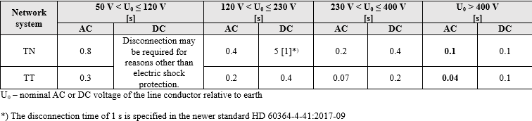 Tab. 1. Required automatic disconnection times in accordance with the requirements of HD 60364-4-41 for sockets with a rated current of ≤63 A and permanently installed receivers with a rated current of ≤32 A